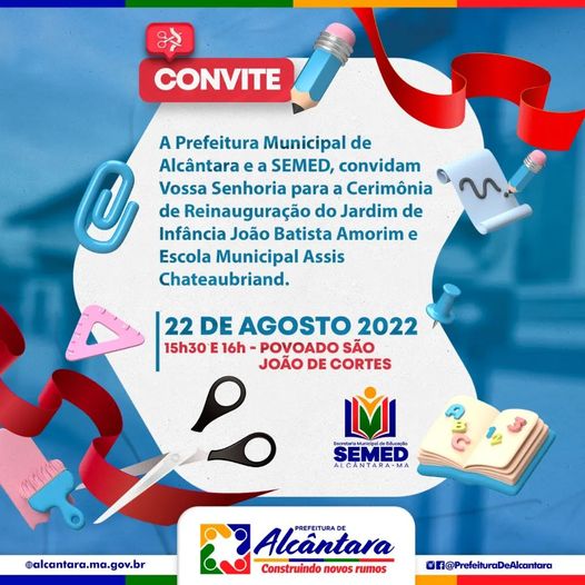 Nesta segunda-feira (22), a prefeitura de Alcântara, por meio da Secretaria Municipal de Educação (SEMED), realizará a Cerimônia de Reinauguração do Jardim de Infância São João Batista Amorim e da Escola Municipal Assis Chateaubriand, localizadas no povoado São João de Cortes, na zona rural do município. O evento duplo está previsto para acontecer às 15h30 e 16h.