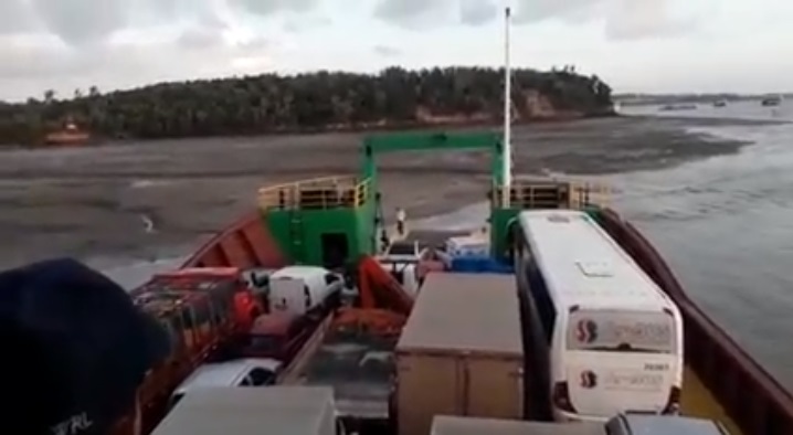 As imagens mostram o ferry boat lotado de carros e passageiros teve que aguardar a maré encher para desencalhar.