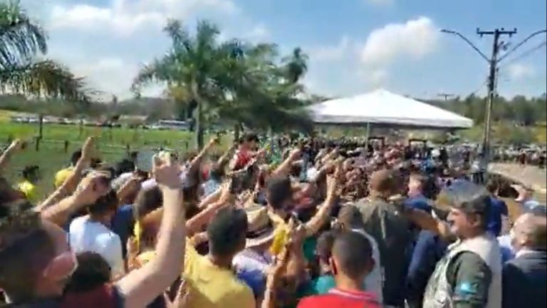A chegada do presidente em Açailândia provocou aglomeração e tumulto. Sem máscara, Bolsonaro cumprimentou apoiadores que ficaram aglomerados em uma grade de proteção, que foi colocada no local. Algo já realizado pela equipe de Bolsonaro para aglomerar e fazer imagem em close.