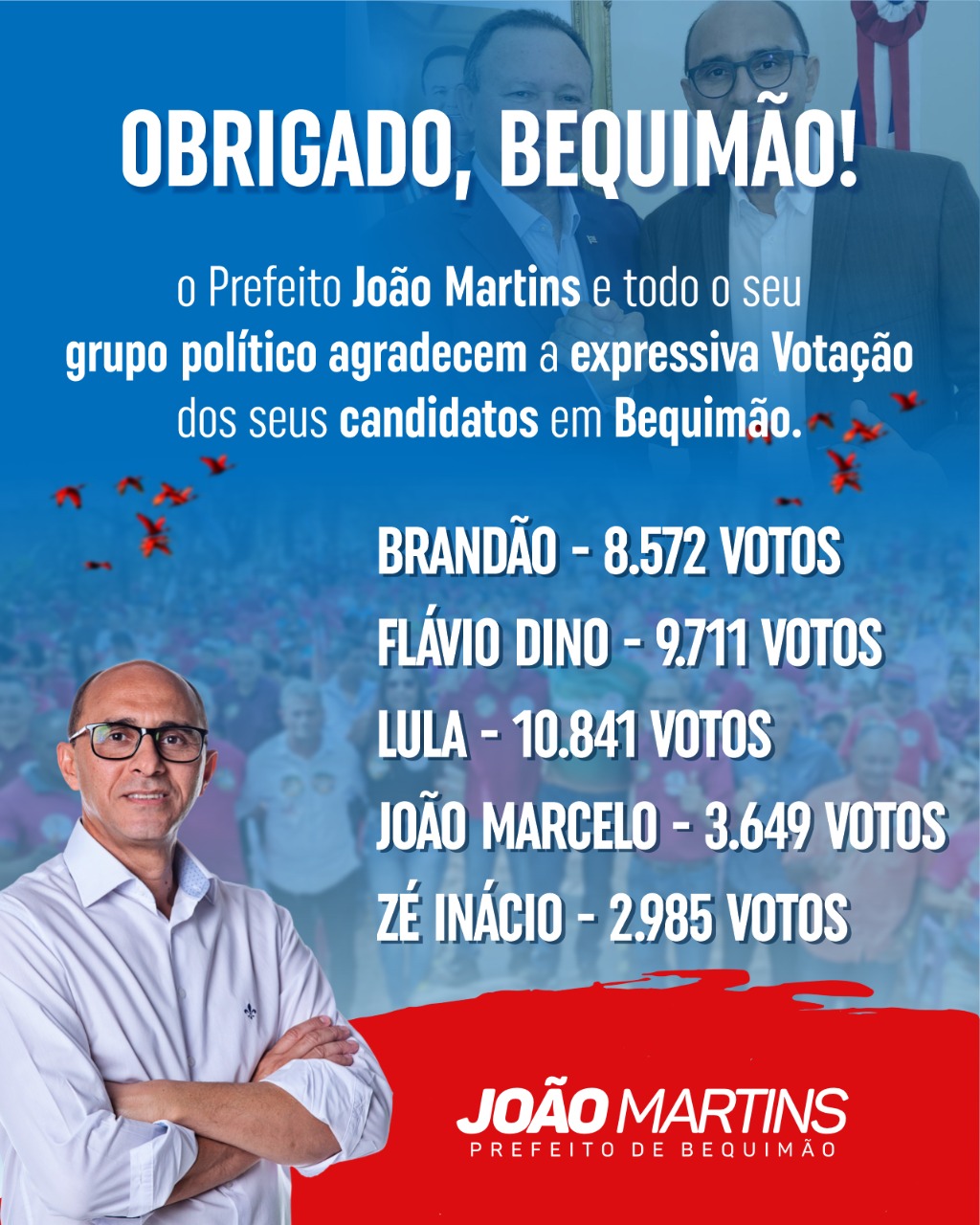O grupo político comandado pelo prefeito João Martins e o ex-prefeito Zé Martins, mostrou mais uma vez sua força e deu a melhor votação a seus candidatos em Bequimão. A alta aprovação da gestão do prefeito João Martins e força política do ex-prefeito Zé Martins refletiram nas urnas as votações expressivas que receberam os candidatos Lula, Carlos Brandão, Flávio Dino, João Marcelo e Zé Inácio.