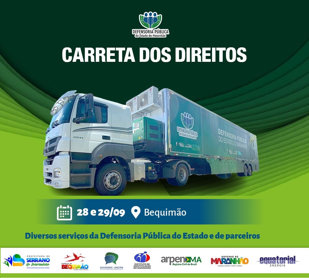 O município de Bequimão recebe a partir desta quinta-feira (28) a visita da Carreta dos Direitos. Os serviços oferecidos pela unidade móvel da Defensoria Pública do Estado do Maranhão (DPE-MA), em parceria com a Prefeitura de Bequimão, vão ser disponibilizados ao moradores do município até a sexta-feira (29). O veículo ficará estacionado na Rua Senador Vitorino Freire, em frente à sede da Prefeitura, com atendimento das 8h às 16h.