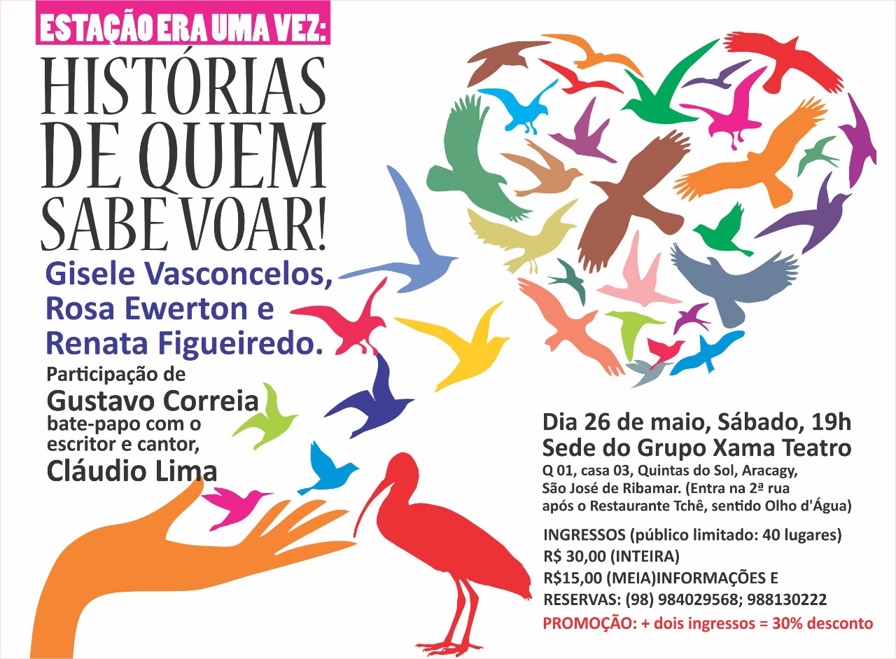 No sábado (26) o grupo Xama Teatro exibirá às 19h peças com o título Histórias De Quem Sabe Voar, com as atrizes Rosa Ewerton, Gisele Vasconcelos e Renta Figueredo. A apresentação também contará com um bate-papo com o escritor e cantor Cláudio Lima, além de sorteio de livros.