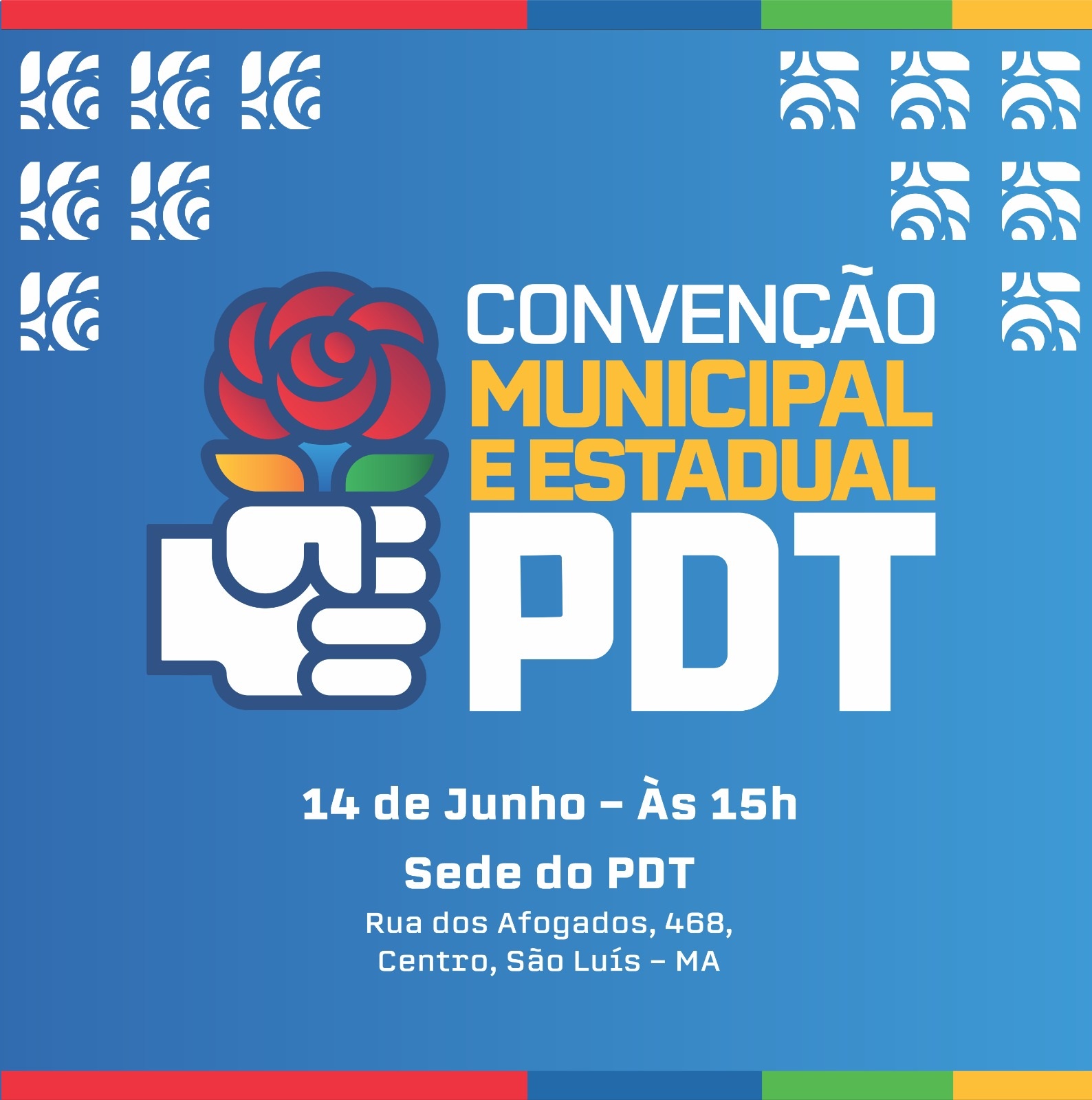 O Partido Democrático Trabalhista (PDT) realizará na próxima sexta-feira (14) a Convenção Estadual e Municipal de São Luís. O evento acontecerá, a partir das 15 horas, no sede do Partido na Rua dos Afogados, 468 – Centro). Durante a convenção, que reunirá militantes, pré-candidatos a vereadores e prefeitos, autoridades e direção nacional do partido, será eleita a nova direção estadual e municipal do PDT. A Convenção estadual do Partido estava prevista para ser realizada no dia 10 de maio e foi cancelada devido ao falecimento de Dona Eunice Honaiser, mãe do deputado federal Márcio Honaiser.