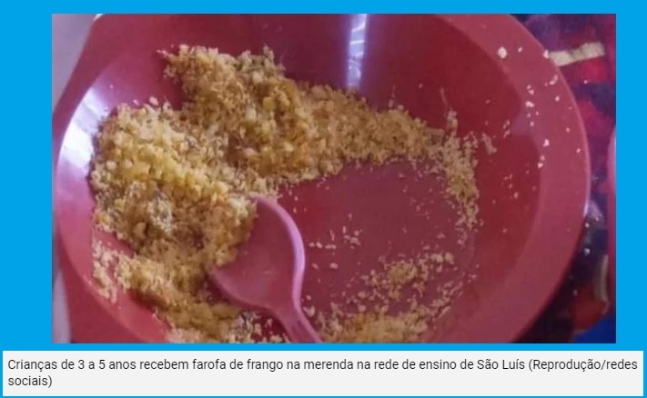 “A Prefeitura de São Luís tem disponibilizado uma farofa com frango para as crianças de 3 a 5 anos. E a farofa é com a farinha amarela – aqui no Maranhão chamada de farinha d’água. “As crianças se engasgam”, disse uma professora ao Imirante.