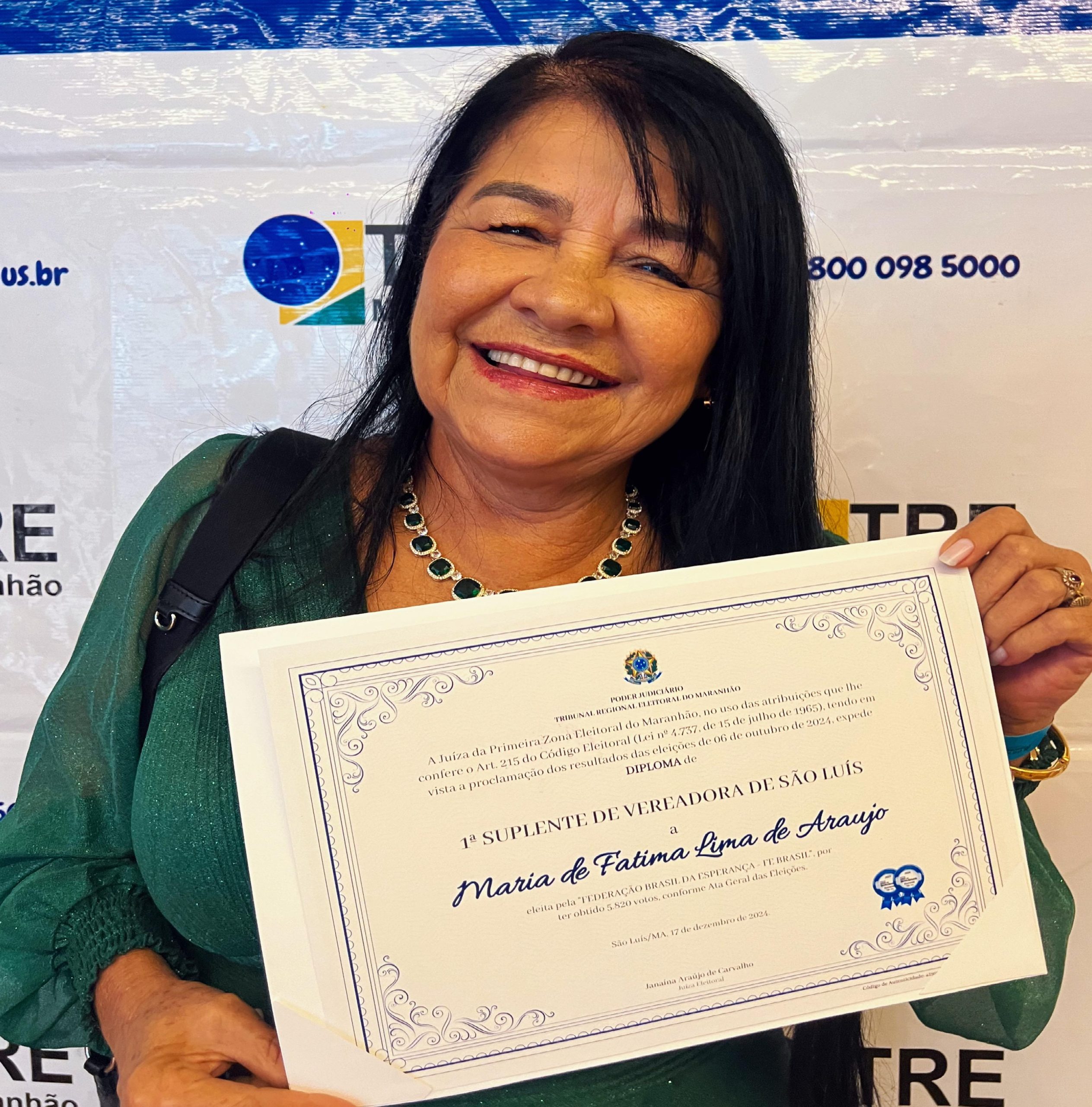 A vereadora de São Luís, Fátima Araújo, foi diplomada nesta terça-feira (17), pela Justiça Eleitoral, em solenidade realizada no auditório da FIEMA, localizado no bairro da Cohama, na capital maranhense, a primeira suplente da Federação Brasil da Esperança.