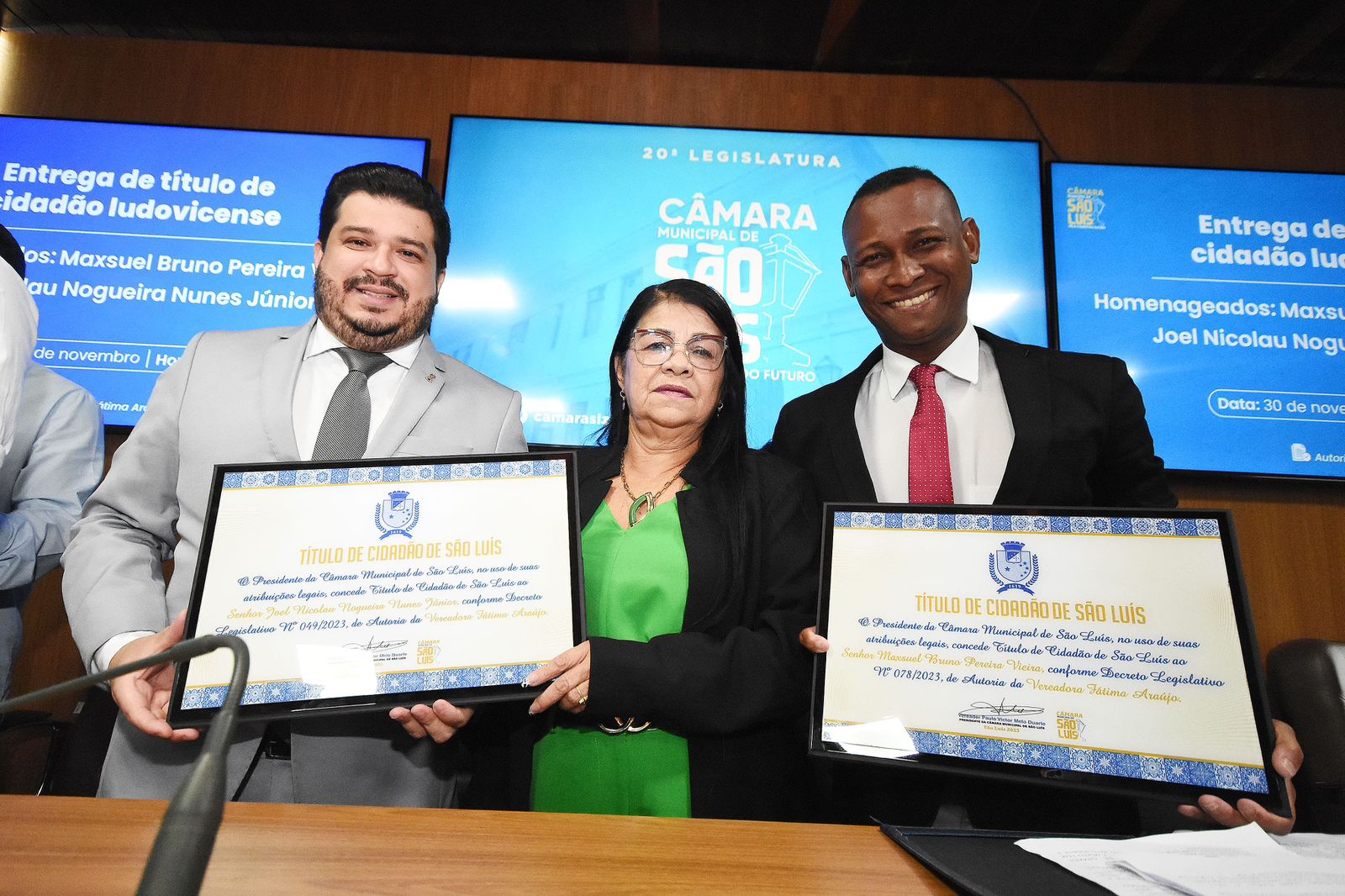 Aconteceu na tarde desta quinta-feira (30), em sessão solene na Câmara de Vereadores de São Luís, a entrega dos Títulos de Cidadão Ludovicense, concedidos pela vereadora Fátima Araújo (PCdoB), ao médico e secretário de Saúde de São Luís Dr. Joel Nunes Júnior e ao radialista e narrador esportivo Maxsuel Bruno. O evento aconteceu no Plenário Simão Estácio da Silveira, com a presença de convidados dos homenagens e funcionários da Casa do Povo.