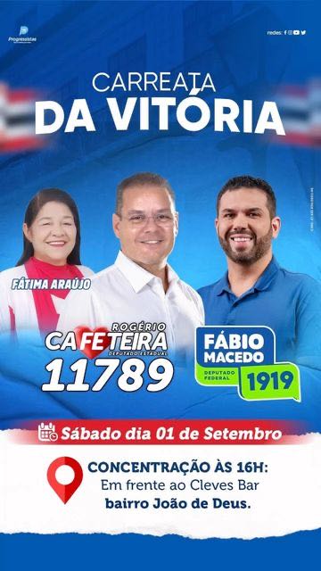 O trabalho será coroado com uma vitória dupla neste domingo (2). Mas para isso, a vereadora Fátima Araújo vai realizar neste sábado (01), a partir das 16h, a Carreata da Vitória, último evento de campanha de seus candidatos Rogério Cafeteira (PP – 11.789) e Fábio Macedo (Podemos – 1919).