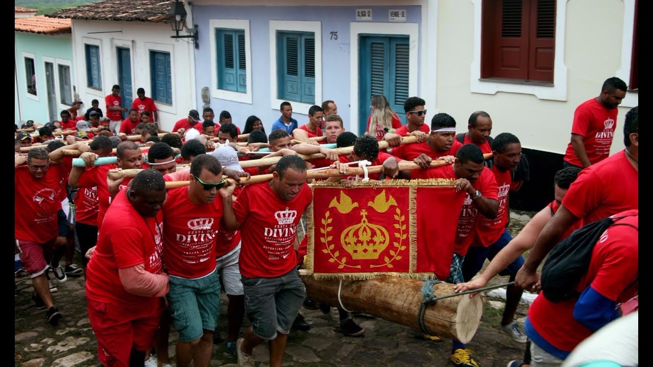 Em um cortejo pelas ruas das cidades, acompanhadas pelas caixeiras que cantam louvores ao Divino Espírito Santo, os homens descem até o porto para buscar o mastro.