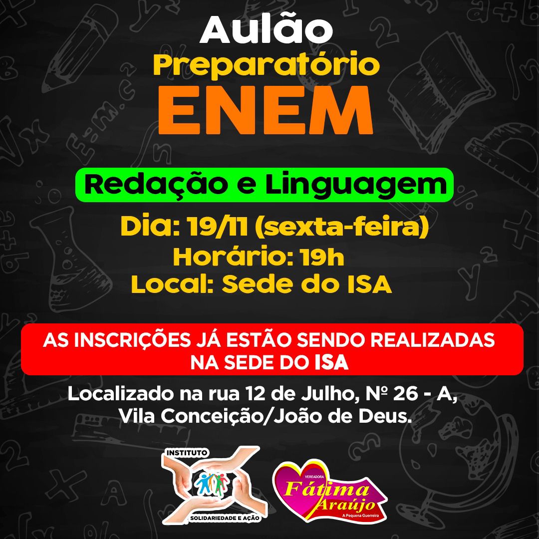 O Instituto ISA, com o apoio da vereadora de São Luís, Fátima Araújo (PCdoB), vai realizar na próxima sexta-feira, dia 19, um grande aulão preparatório de redação e linguagem para o Exame Nacional de Ensino Médio (Enem) 2021.
