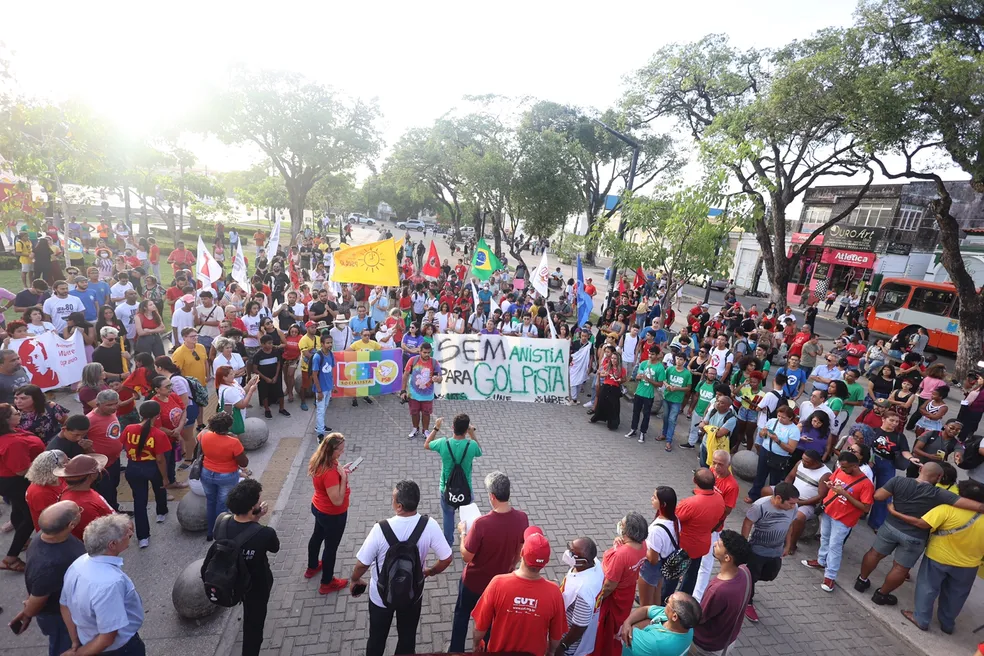 Os manifestantes carregaram cartazes com frases “Sem anistia, para golpista”, “Terroristas bolsonaristas na cadeia já” e “Evangélicos pela democracia”. Bandeiras de movimentos e partidos políticos também fazem parte do protesto.