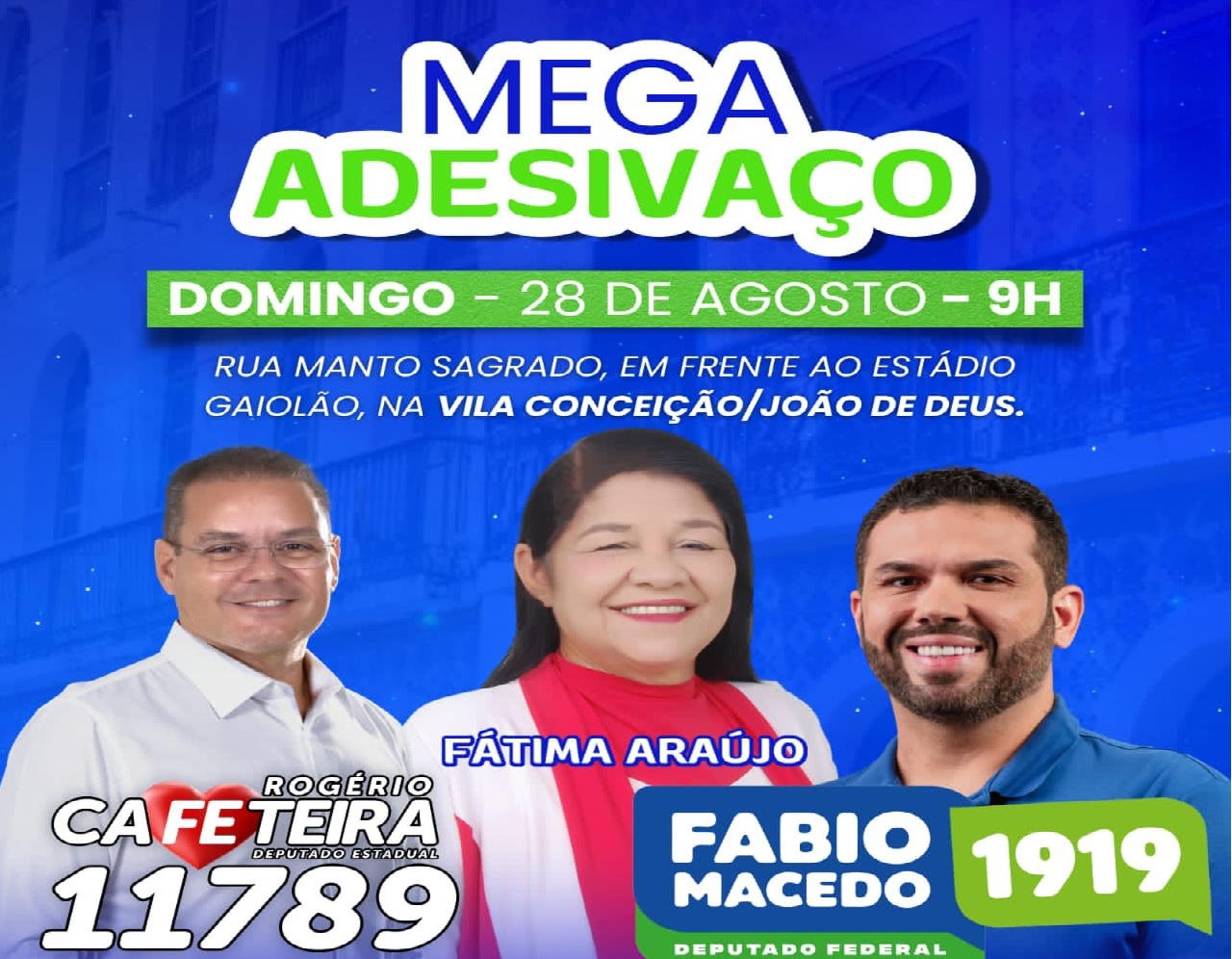 Coordenadora da campanha dos candidatos Rogério Cafeteira (PP-11.789) e Fábio Macedo (Podemos-1919), aos cargos de deputado estadual e federal, respectivamente, no Complexo de Comunidades do João de Deus, a vereadora de São Luís, Fátima Araújo (PCdoB), publicou em suas redes sociais avisando que neste domingo (28), a partir das 9h, será realizada um Mega Adesivaço de seus candidatos, na rua Manto Sagrado, em frente ao Estádio Gaiolão, no bairro Vila Conceição/João de Deus.