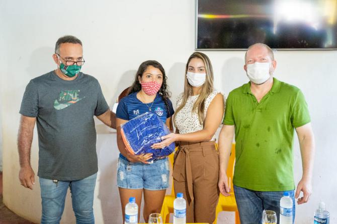 Othelino e a prefeita de Presidente Sarney, Valéria Castro, entregam os kits aos representantes dos clubes locais