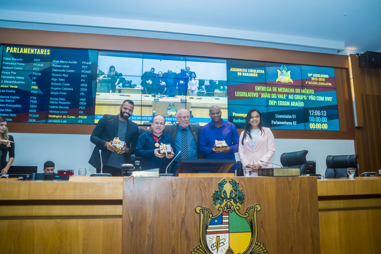 Em sessão solene, a Assembleia Legislativa realizou, na manhã desta quinta-feira (18), a entrega da Medalha do Mérito Legislativo João do Vale ao grupo de atores maranhenses da comédia “Pão com Ovo”. Durante a solenidade, presidida pela deputada Ana do Gás (PCdoB), o deputado Edson Araújo (PSB), autor da proposição, destacou a importância e o alcance do trabalho realizado pelos atores César Boaes, Adeilson Santos e Charles Júnior.