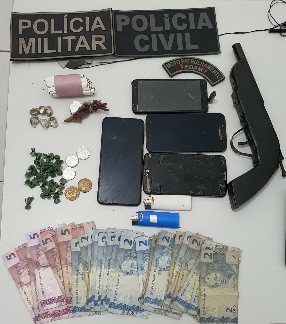Com os acusados foram encontrados R$100 (cem reais em espécie), 05 aparelhos de celular (3 Samsung, 1 LG e 1 alcatel), 01 Garruncha calibre 38, 01 munição 38, 25 cabeças de substância semelhante a crack, 06 papelotes de substância semelhante a maconha, 01 pedra de substância semelhante a cocaína, 01 maço de cigarro comum, 02 dois isqueiros, 01 relógio de pulso, 02 caixas de som grande e 01 amplificador.