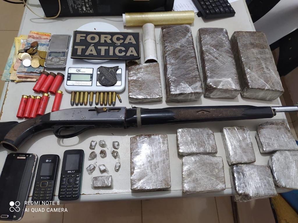 Ao todo foram apreendidos 3 kg e 500 grama de maconha, uma motocicleta Honda de cor vermelha, um rifle calibre 22, munições de vários calibres, balança de precisão, dinheiro e material usado pra embalar a droga.