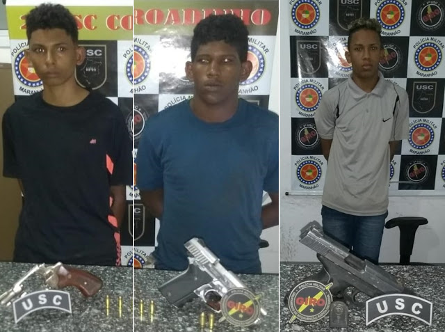 Com o trio, foram apreendidos um revólver calibre 32, uma pistola taurus calibre 380 e uma pistola .40.