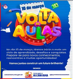A Prefeitura de Alcântara, por meio da Secretaria Municipal de Educação (SEMED), anunciou nesta sexta-feira (7) o início do ano letivo na rede municipal de ensino. De acordo com o comunicado publicado nas redes sociais, as aulas terão início nesta segunda-feira, dia 10 de março.