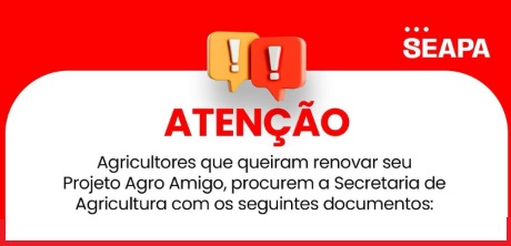 A Prefeitura de Alcântara, por meio da Secretaria Municipal de Agricultura, Pesca e Aquicultura (SEAPA), convoca os agricultores alcantarenses que desejam renovar seu Projeto Agro Amigo a comparecerem à SEAPA no dia 26 de fevereiro, a partir das 8h30, na sede da secretaria, localizada próximo à Farmácia do Trabalhador, em Alcântara-MA.