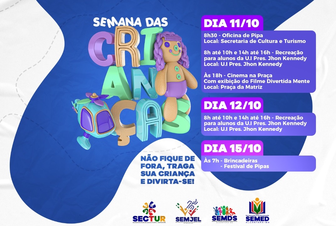 A Prefeitura de Alcântara, por meio das Secretarias de Cultura e Turismo, Educação, Esporte e Lazer, e Assistência Social, está proporcionando às crianças do município, momento de diversão. A programação da Semana da Criança inclui jogos, brincadeiras tradicionais e festival de pipa.