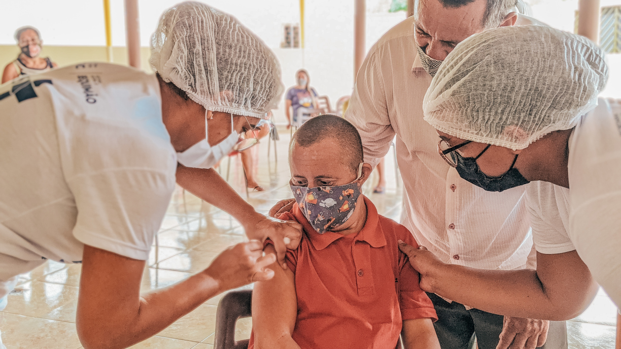 A lavradora Paula Erimita chegou ao Centro Municipal de Vacinação bem cedinho. Ela é natural da comunidade Geniparana e levou o filho down, Lusivan Reis, para se imunizar. “A gente fica muito feliz de ter a vacina, porque já é mais uma segurança pra gente, para mim e para o meu filho. Eu já me vacinei e amanhã volto pra receber a segunda dose da Coronavac. Ele recebe hoje a sua primeira dose. E nós já estamos aqui, firmes e fortes”, conta, orgulhosa, a lavradora.