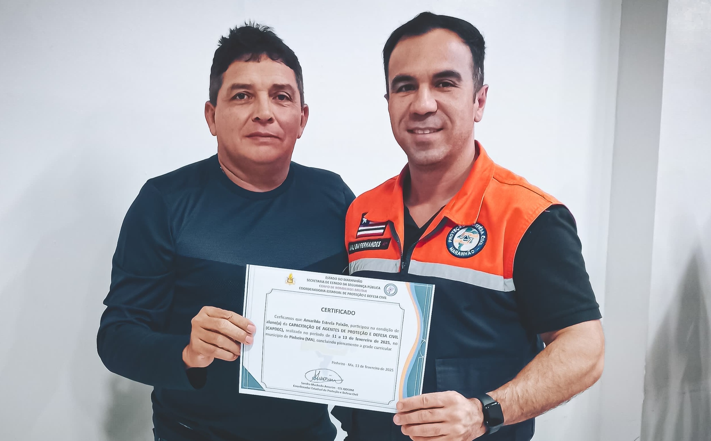 O coordenador municipal de Proteção e Defesa Civil (COMPDEC), Amarildo Estrela Paixão, concluiu a Capacitação de Agentes de Proteção e Defesa Civil (CAPDEC). O curso, realizado entre os dias 11 e 13 de fevereiro de 2025, no município de Pinheiro, foi promovido pelo Corpo de Bombeiros Militar do Maranhão e pela Coordenadoria Estadual de Proteção e Defesa Civil.