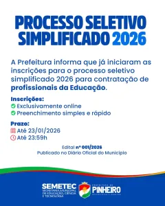 A Prefeitura de Pinheiro, por meio da Secretaria Municipal de Educação, Ciência e Tecnologia (SEMETEC), publicou no Diário Oficial do Município o Edital nº 001/2026, que regulamenta o Processo Seletivo Simplificado 2026 destinado à contratação de profissionais da educação para a rede municipal de ensino.
