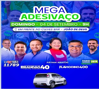 Neste domingo (4), o Complexo de Comunidades do João de Deus receberá dois mega eventos de Rogério Cafeteira e Fábio Macedo. O primeiro evento terá início às 9h da manhã, com um mega adesivaço com plotagens de veículos, incluindo Rogério Cafeteira (PP-11.789), Fábio Macedo (Podemos-1919), Flávio Dino (PSB-400) e Carlos Brandão (PSB-40), candidatos apoiados por Fátima Araújo (PCdoB), vereadora de São Luís, maior liderança política no Complexo de bairros do João de Deus.