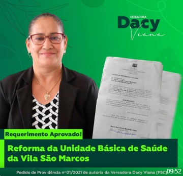 Ciente do descaso do prefeito Almeida Sousa (PL) com a saúde do município, a vereadora Dacy Viana (PSC), esposa do ex-vereador Viana, solicitou via requerimento Nº 01/2021, aprovado na sessão da última sexta-feira (21), na Câmara Municipal, uma reforma em caráter de extrema urgência na Unidade Básica de Saúde (UBS), localizada no bairro Vila São Marcos, na cidade de Igarapé do Meio-MA.
