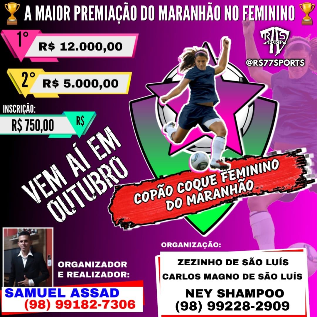Trata-se do Copão Coque Feminino do Maranhão, que vai premiar a equipe campeã com R$ 12 mil reais e a segunda colocada com R$ 5 mil reais; a inscrição vai custar R$ 750 reais por cada equipe.